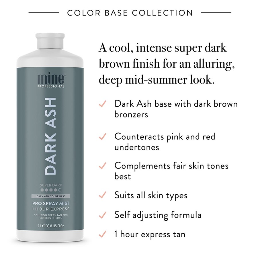 Dark Ash Pro Spray Mist 1L suits all skin types and tones for those wanting a cool, intense super dark brown skin finish. Look like you've just returned from Rio. Dark Ash gives you a cool, intense super dark brown finish.
