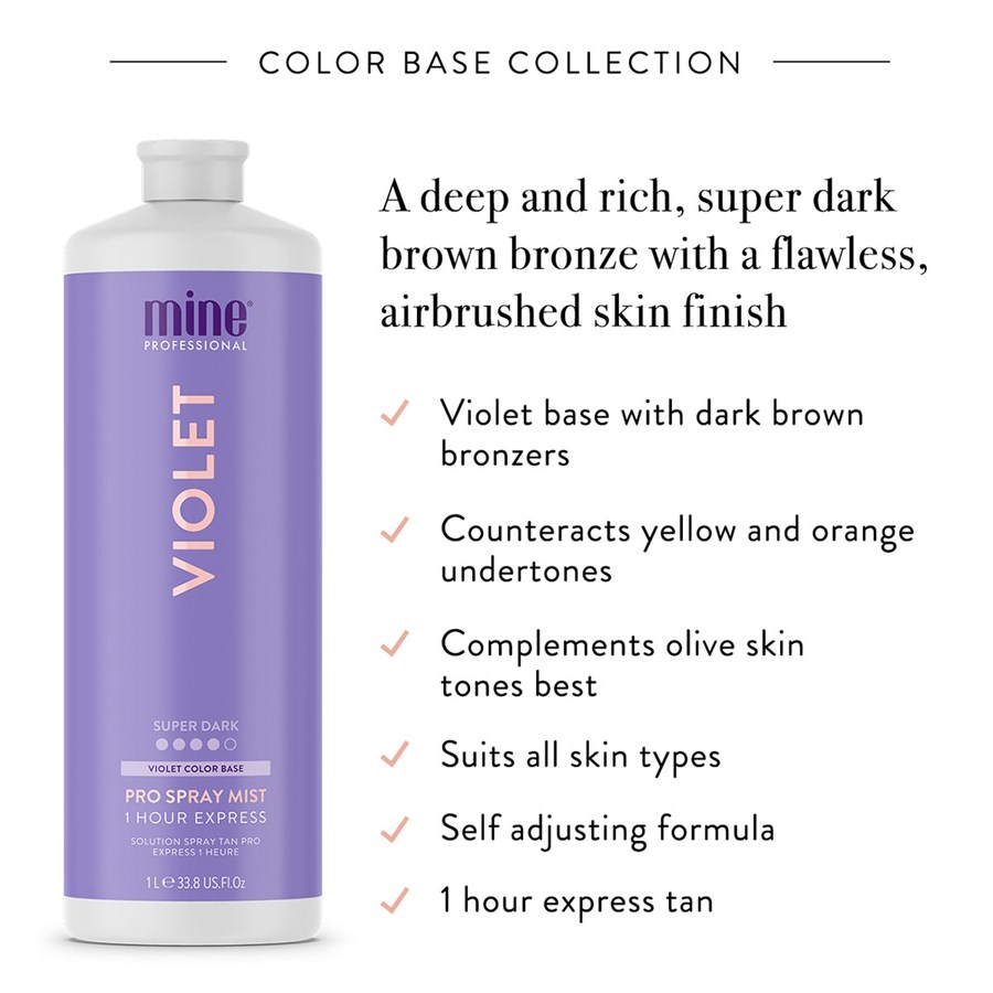 Violet Pro Spray Mist 1L suits all skin types and tones for those wanting a rich, warm super dark brown skin finish. Look like you've just stepped off the beach in Positano or flew in from a Mediterranean holiday escape. Violet gives you a rich, super dark brown finish.
