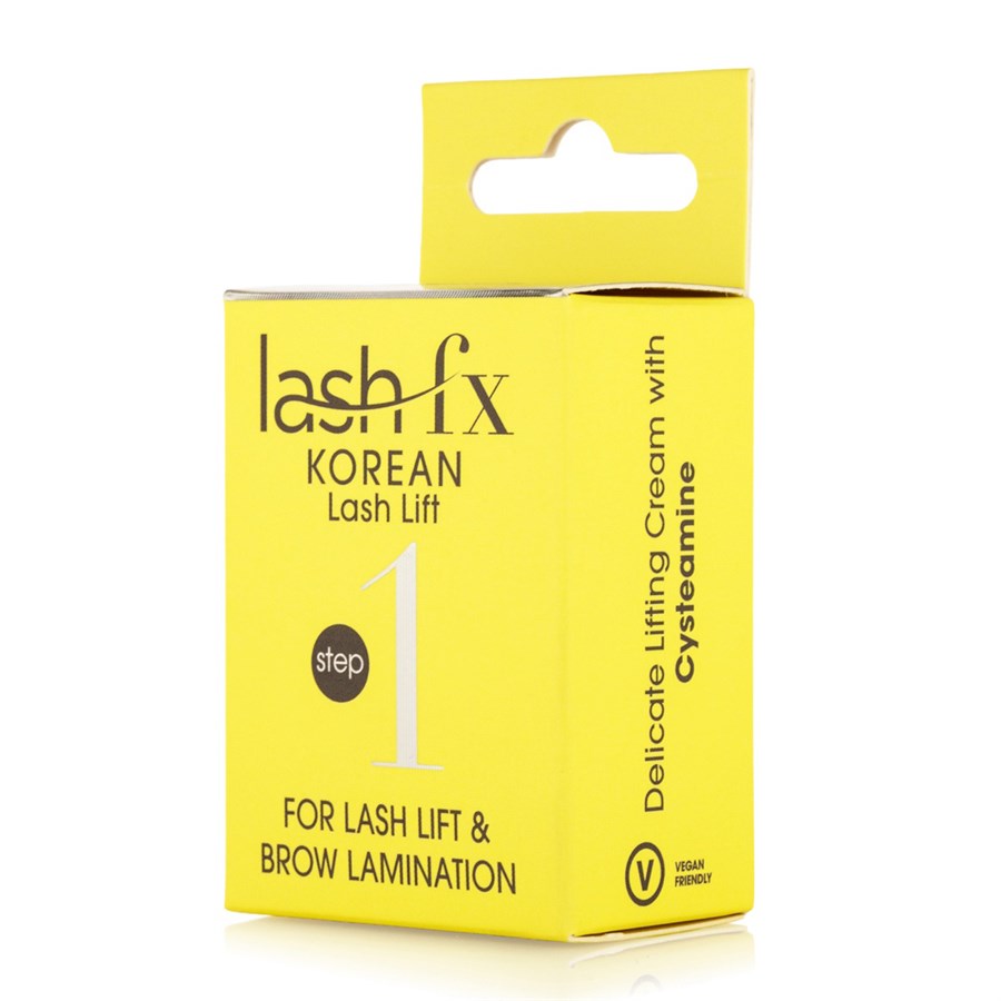 Lash FX Korean Lash Lift Step 1 Lifting Cream with Cysteamine formula gently lifts and shapes natural lashes. Thioglycolate-free for a safe, hydrating treatment that delivers long-lasting, stunning lash lift results. 10 sachets.