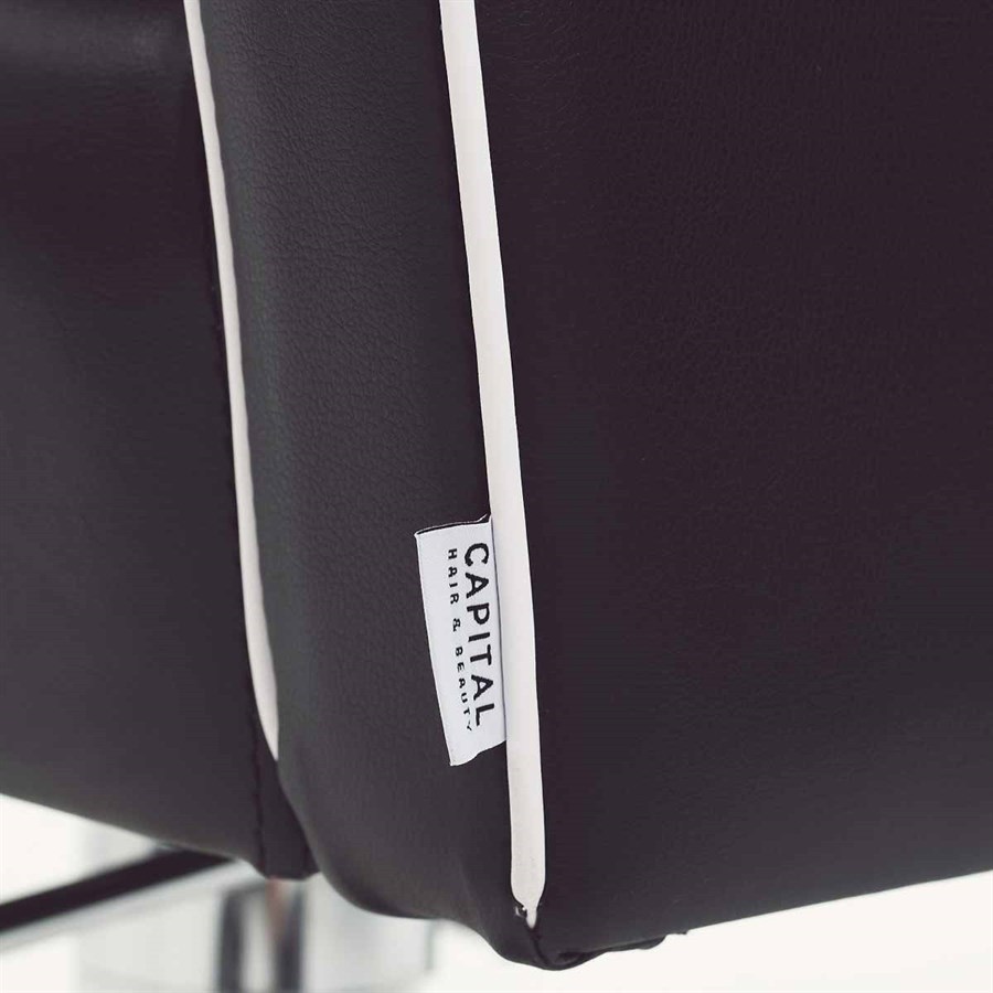 This Kingsbury Styling Chair has an appealing shape with distinctive lines and is an attractive addition to any salon. Delivered with a square base and fully hydraulic pump. Available in black with white piping only.