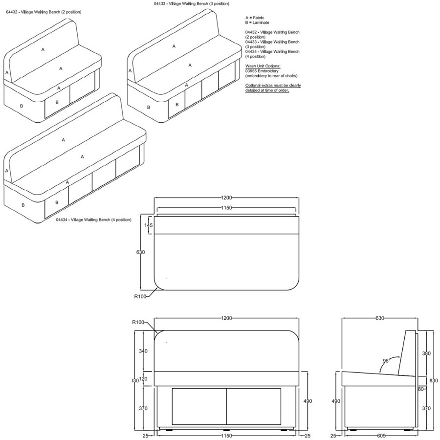 The Village Waiting Seat combines comfortable seating with added storage. Choose from a 2, 3 or 4 seater seat each with lower storage cupboards and the option of choosing from 25 fabric and laminate finished