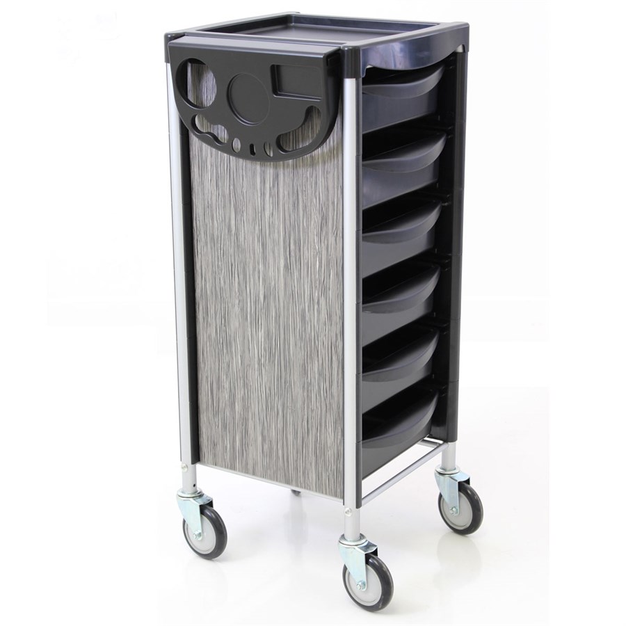 Available in a range of laminates. The modern Apollo Lux Trolley is versatile and practical with its useful storage system for any hairdressers or beauty Salon. This compact steel frame trolley features easy-clean castors, a dryer holster, six sliding trays and flip out trays, which can accommodate accessories for a larger working area.