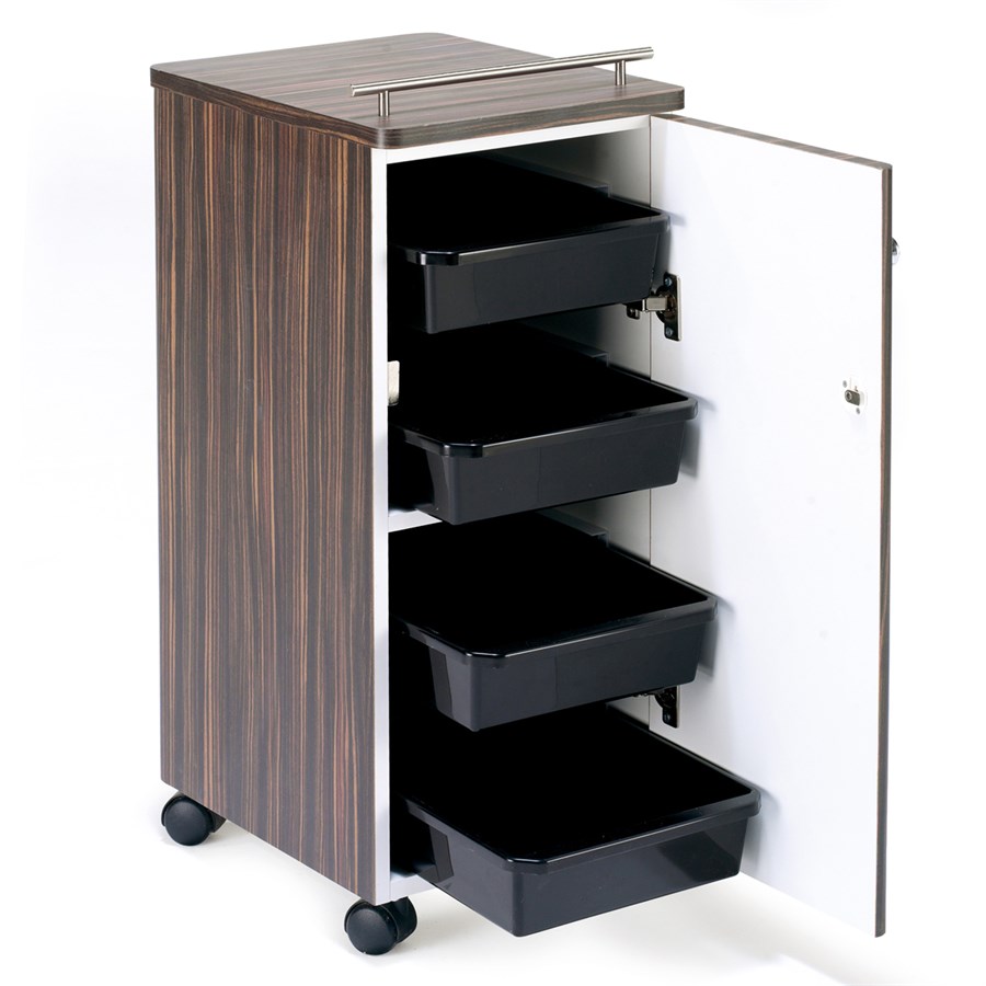 Prima is a high-quality Hair and Beauty Salon Trolley with a refined look. This trolley will complement the most elegant of Salon work spaces. Includes a fixed shelf, four sliding trays and a lockable door. The brushed steel handle makes it easier to move the trolley around.