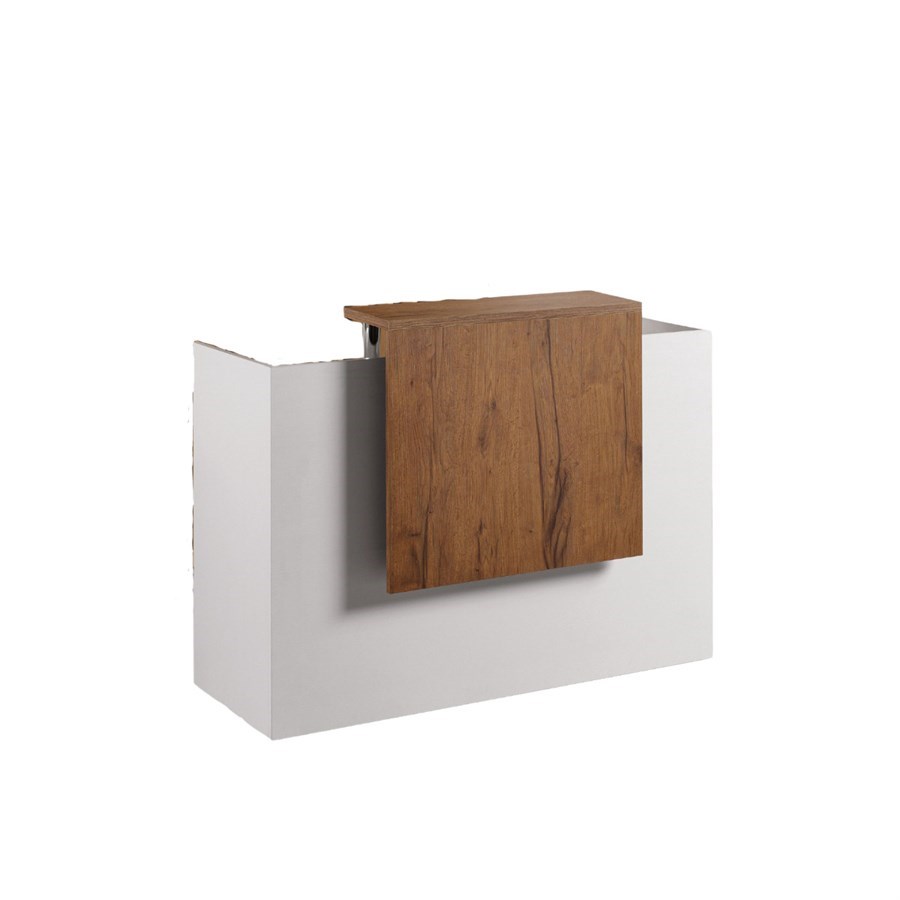 Reception desk with large dimensions. The white ashcoloured structure is equipped with several open compartments, a cabinet and a drawer with lock. The characterizing melamine front is available in different wood finishes.