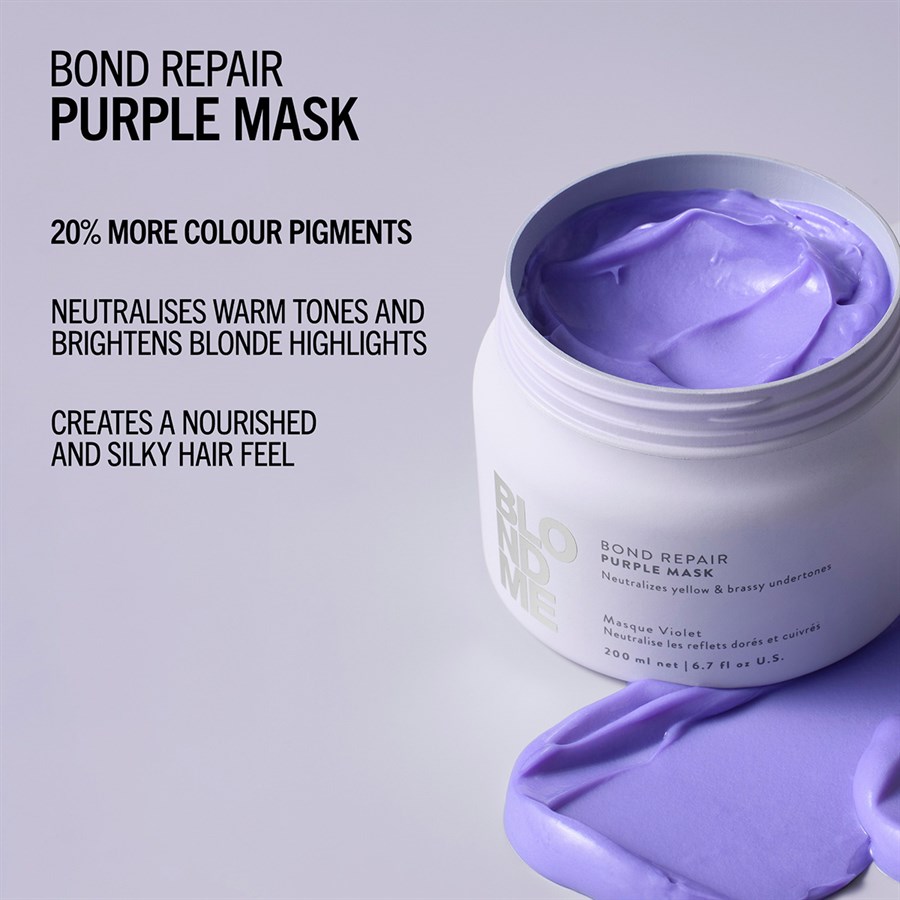Neutralising yellow undertones and helping to prevent brassiness, BlondMe Bond Repair Purple Mask with BOND REPAIR TECHNOLOGY intensively nourishes the hair. Enriched with Almond Oil and Cornflower, the formula delivers targeted levels of cool pigments to maintain a fresh cool tone direction for improved blonde clarity, without changing the hair colour. Restoring radiance and shine, it strengthens the hair by building inner hair bonds, repairing damage equivalent to two lightening services after just one use.