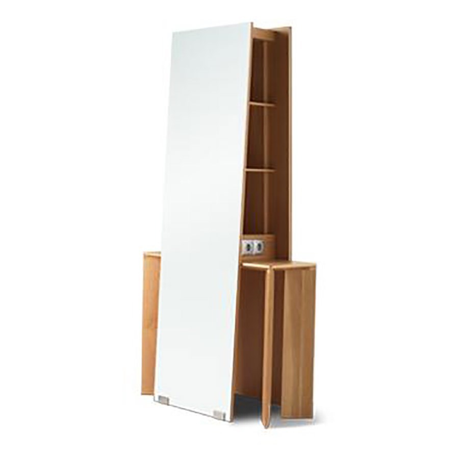 Angular, towering two-way contemporary centrepiece station furniture arranged to seat two Clients. Features include wood veneer options, built-in shelving & 4 integrated power sockets.