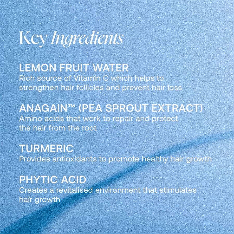 AnaGain™(Pea Sprout Extract), Phytic Acid, and Turmeric - Revitalises and stimulates hair growth at the scalp