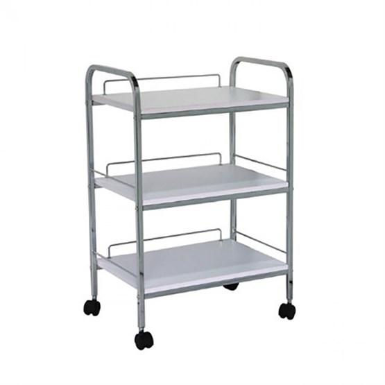 The trolley is both stylish and functional, designed with 3 large shelves and plenty of storage space for products and equipment. It features a chrome frame, white shelves and chrome holder. Screws can be found attached to the shelves.