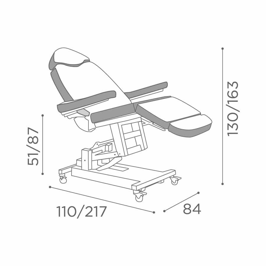 The Dallas can be moved into a variety of positions, with the chair height regulated by an electric foot pedal, the angle of the seat and backrest regulated by two separate gas pedals, and the two separate legrests adjustable manually. The chair comes complete with two armrests that are rotatable, allowing them to be utilised when the Dallas is positioned as either as a chair or a bed. The legrests and headrest can also be extended to allow greater comfort for customers of any type.