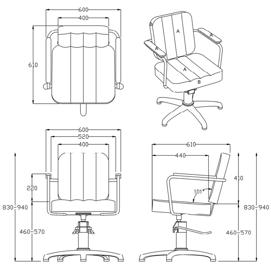 - Chrome plated hydraulic lift with 5 star base Black tubular steel arms with cushions
