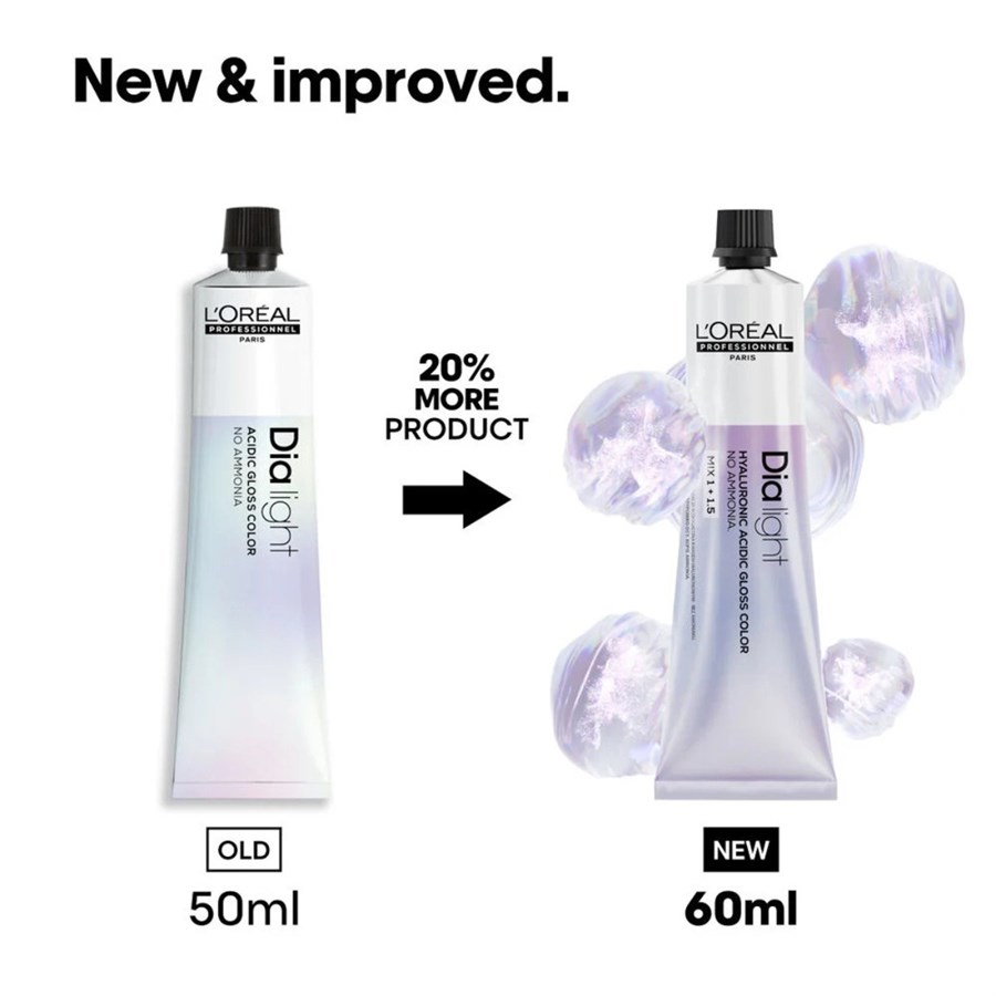 The future of gloss colour is hyaluronic. New Dia light, powered by 1% Hyaluronic Acid complex. Instantly replenishes lost moisture by enrobing the hair fiber in a hydrating film.This new formula is ammonia free.