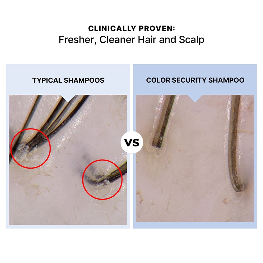 Today, most shampoos contain unnecessary added ingredients to deliver extra benefits. Like, silicones to smooth, conditioners to hydrate, thickening agents to make hair feel fuller. The problem is, these ingredients are engineered to not rinse out easily. They cling to your hair and scalp, leaving filmy residues that build up and make your hair dull. Or worst of all, block your hair follicles which can cause hair thinning and loss. Our Color Security Shampoo is a total departure! Every ingredient in our groundbreaking, 100% clean, sulphate-free formula rinses off completely. So you always end up with the cleanest, freshest, healthiest hair and scalp possible.