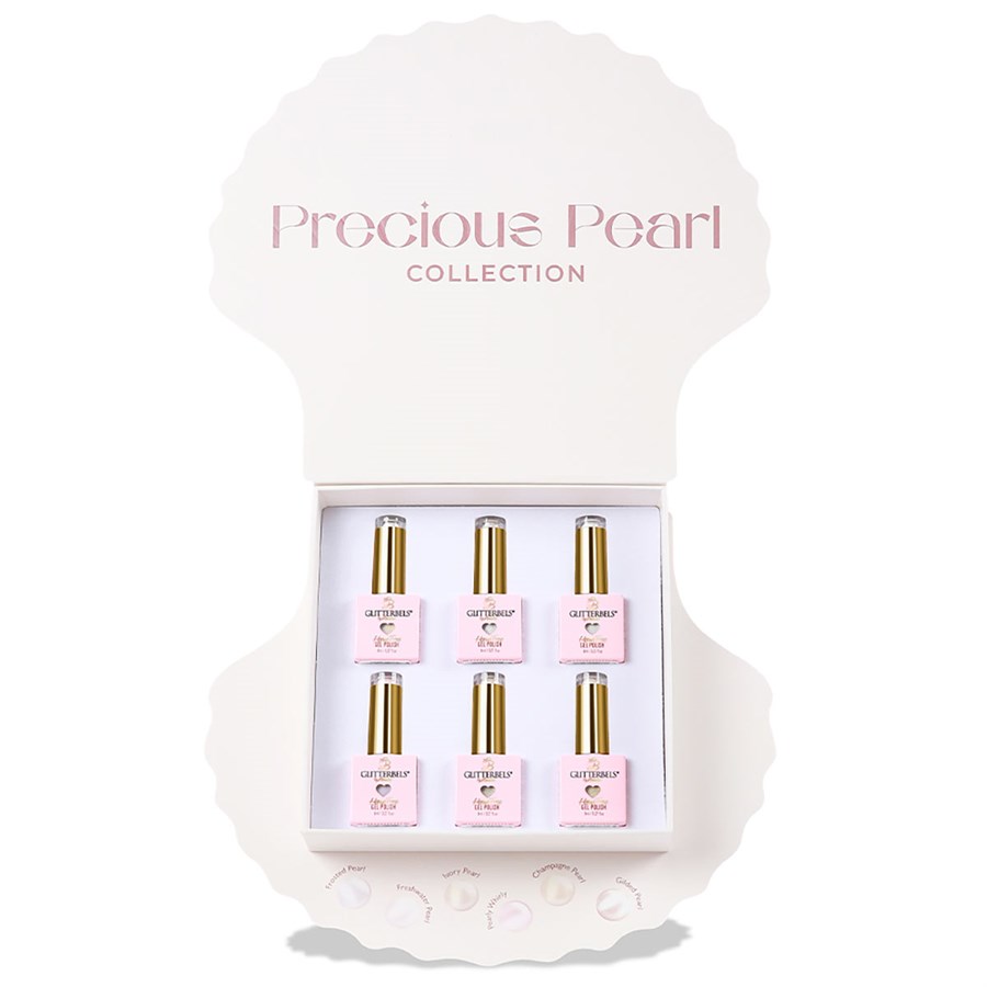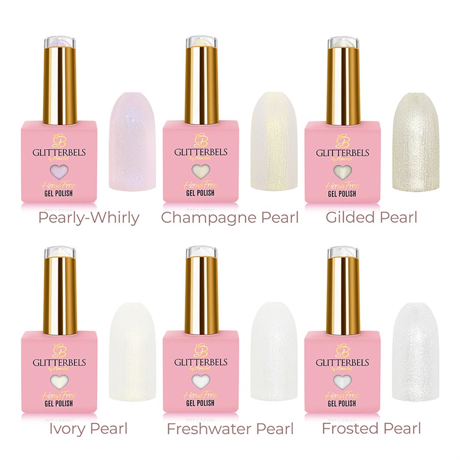 Six pearl-inspired shades with gold, silver, white, and pink undertones. Designed to flatter all skin tones. Discover refined radiance with the Glitterbels Precious Pearl Collection - a luxurious set of six pearl-finish nail polish shades, expertly created by professional nail techs, for professional nail techs.