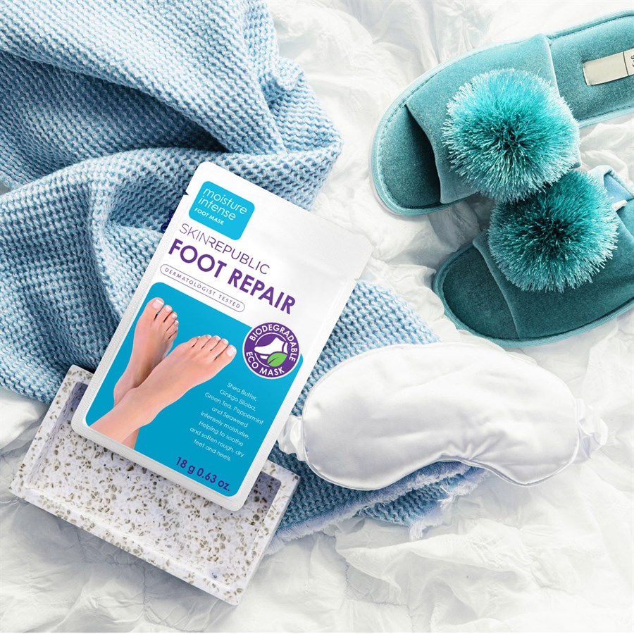 Cleanse feet, tear open sachet and remove booties, place feet inside (taking care to make sure your foot is inside the inner layer), wear for 15-20 minutes, remove masks, do not rinse.