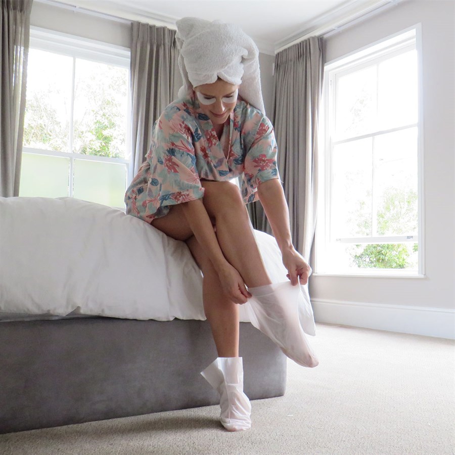 Dual layered booties contain an intensive moisturising serum packed with Plant Extracts for soft, silky smooth feet.