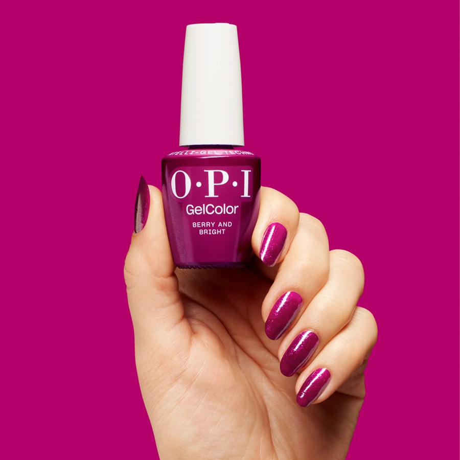 Get berry merry this holiday season with Berry and Bright, a juicy red shimmer gel polish - perfect for holiday nails that shine at every party.