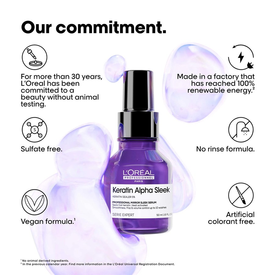 Keratin Alpha Sleek Mirror Sleek Serum by L'Oréal Professionnel is formulated with Keratin Sealer 5%. It seals hair keratin structure for long-lasting smoothness, volume control up to 10 washes. It is anti-humidity up to 80% humidity in the air. Keratin is an animal-derived ingredient, also found in human hair. This product does not contain Keratin.