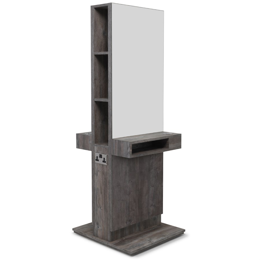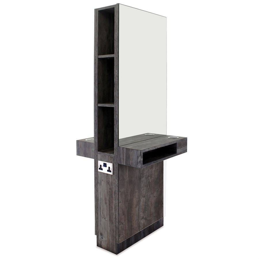 This Rimini Island Styling Station does not feature a lower mirror. It offers a variety of storage with both a rear and front shelf. It's sleek, space-saving design will compliment any salon. This Island can seat a customer on either side of the unit.